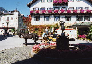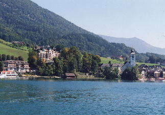 | サンクト・ギルゲンから遊覧船に乗って40分ほどでサンクト・ヴォルフガングに到着。 教会とオペラ「白馬亭にて」の舞台ホテル「Hotel im Weissen Rossl」がある。 |