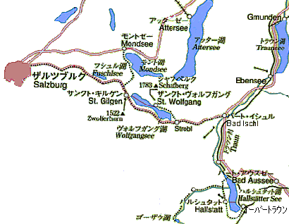 | ザルツカンマーグートは、ザルツブルグの南東にいくつもの湖と2000m級山が連なる一帯を言う。美しい自然が広がり、オーストリアの「湖水地方」と呼ばれている。 |