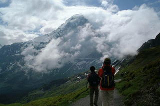 | メンリッヒェン〜クライネ・シャイデック メンリッヒェンからクライネ・シャイデックまでは、なだらかでとても人気のハイキングコース。たくさんのハイカーが歩いている。アイガーを前に、高山植物を写真に収め、ゆっくり散策を楽しみながらクライネ・シャイデックに到着。 |