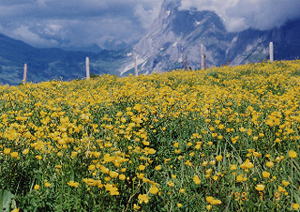 | 電車を下りるとすぐ左手に、アイガーグレッチャー(氷河)の先端が大迫力で迫ってくる。氷河の脇を歩くような感覚で、ハイキングを楽しむことができる。 このコースは是非歩いてみたかった。でもすぐ氷河を通り過ぎ、後は一面に黄色の絨毯のようなお花畑が広がっていた。 |