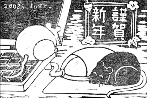 ・ねずみ年.ひとまわり前は,渾身の一枚を彫ったのだった. ・さて,ねずみかぁ...どうするかな.日本昔話風にしようと思ったのだけど,漫画になりそうだった.で,まぁ,現代風(?)にマウスでいいや,と.ひねりがたりないっ ・あれ,これって,おやじギャグってやつかしら? ・久しぶりに,文字を間違えて彫った.とほほ.あとから修正した.