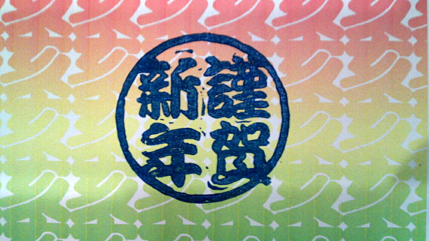 ・ネタもないし,直前までどうしようかなぁと迷い続け,彫るのを諦めました. ・「亥」を繰り返し繰り返しはりつけて背景にして,グラデーションをかけて,プリンタで印刷. ・その上に,以前彫った謹賀新年の判を使いまわしで刷りました. ・基本,プリンタ使用なので,出来上がりの品質の均一さはいい...