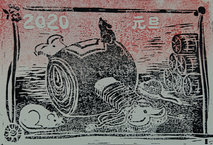 ・ねずみだ.昨年は手抜きっぽかったので,今年はちゃんと彫ろう.そう,彫りに力を入れようと思った. ・が,ネタとしては以前と少しかぶっている.米俵が「うちでの小槌」に変わっているが,全体のイメージは重なっている. ・背景は朝日っぽくしたかったのだけど,どうも枚数を重ねると絵具が固まって滑らかに刷れなくなるのだな. ・細部まで頑張って彫ったのだが,刷りが下手すぎていまいち上手く見えていない...重ね刷りのせいか?