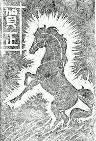 ・ゴム版です.このころはもう,ゴム版しか考えられなかった. ・どうやって図柄を考えたのかなぁ.何かの本を何かを見たはずです. ・馬の周りの彫り残しが稲妻のようだと言われました.うーーん.何でこんな風に残したんだ?