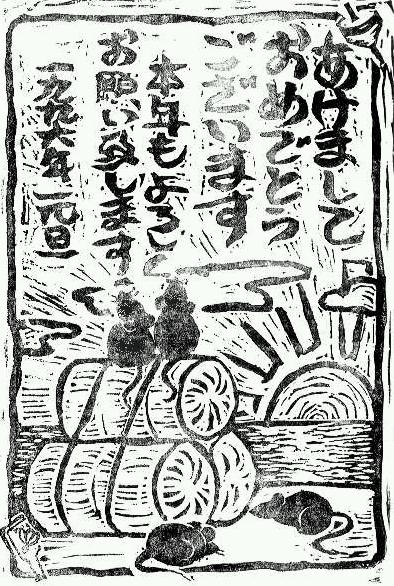 ・自画自賛の一枚!ゴム版です.時間かかりました. ・懐かしの「グランゾート」を20話近く見ながら彫り続けました.ほとんど徹夜. ・図柄はネズミと言えば米俵.正月と言えば日の出.日の出と言えば海なのです. ・これだけ彫ると,文字を書く場所はありません.刷って出すだけ.