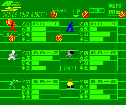 Aロボット選択プレーヤー: 左が1P。右が2P(COM)。1Pのロボットを選択する場合は、右の1Pボタンをクリックします。(最初は1Pに)