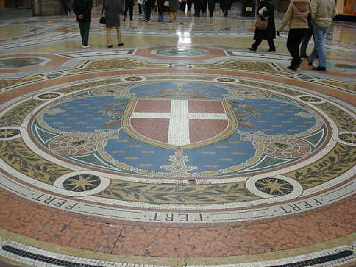 中はアーケードになっていて有名なブランドのお店が並んでいました また十字路の床には紋章がモザイクで装飾されていました。 |