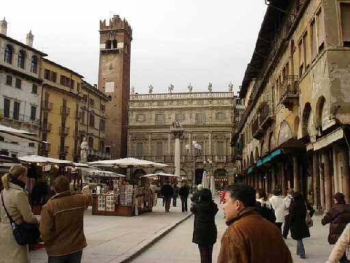 (左)ヴェローナ市街を 流れる川沿いの 美しい風景 (右)街の中心 エルベ広場 |