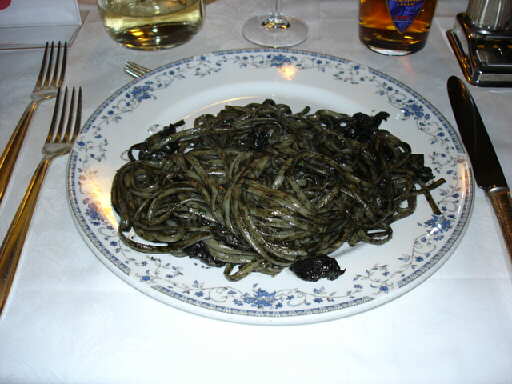 この日の夕食は ホテルのレストランで 見た目はちょっと グロテスクな イカ墨のパスタ |