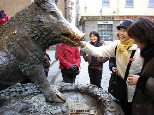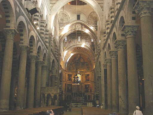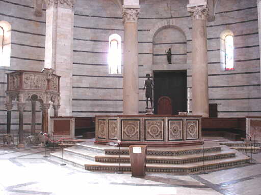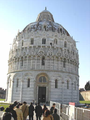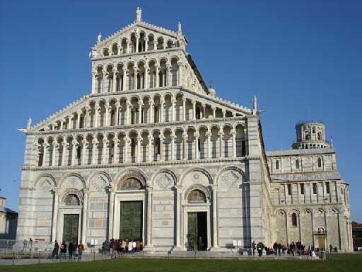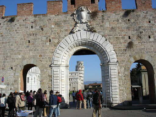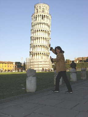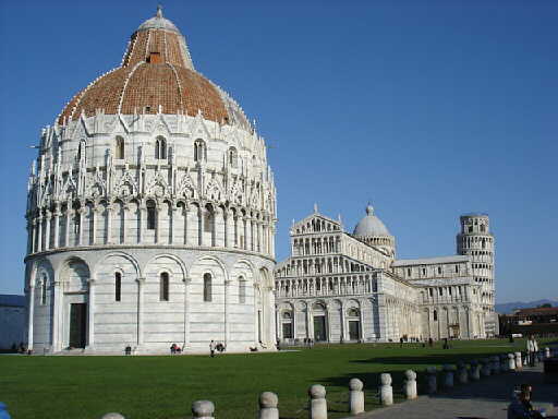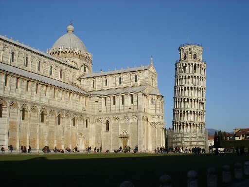 | 傾きの由来:このあたりはアルノ川の河口の堆積層にあるため地層が柔らかく、建設が始まって4階部分ができた頃、塔は既に傾きはじめた、しかし 建設は止まることなく今度は傾きと逆の方向に階が積み上げられ一番上の階はまっすぐに建設された。 ですからよく見ると塔は最初右に傾き、その後5階から左に傾きそして一番上の階は まっすぐ向いていませんか? |