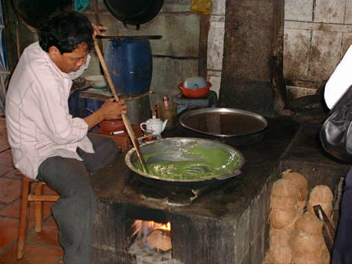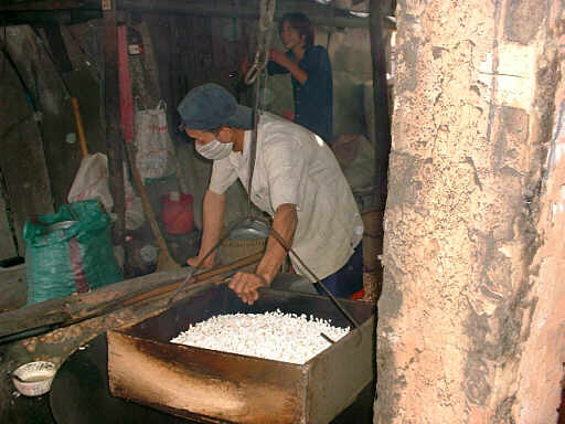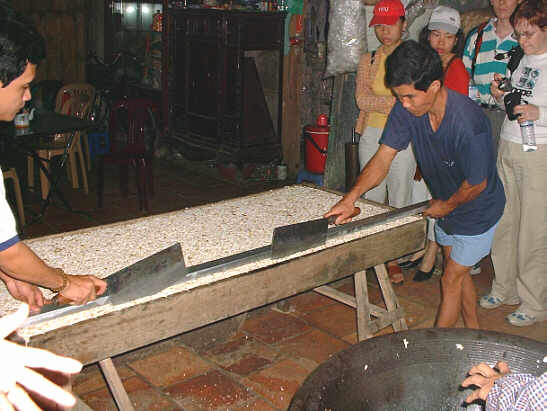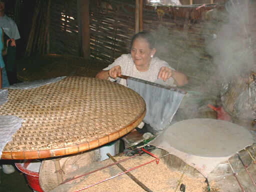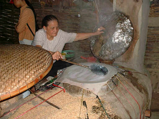 続いて訪れたのは生春巻きの皮の工場。 米を溶いて伸ばして蒸して皮にします。 |