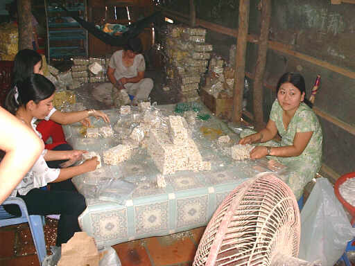 飴を絡めて型に流し 固めます。 それを同じ幅に二人で 包丁の大きなもので 切っていきます。 切った物をひとつひとつ 手作業で女の子達が 袋に詰めます。 |