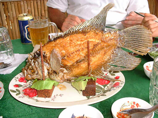 ご飯に揚げ春巻き、豚肉のソテー、そしてインゲンに似た野菜。 右は特別オーダーの エレファントイヤー・フィッシュの揚げ物。 結構おいしかった。 |