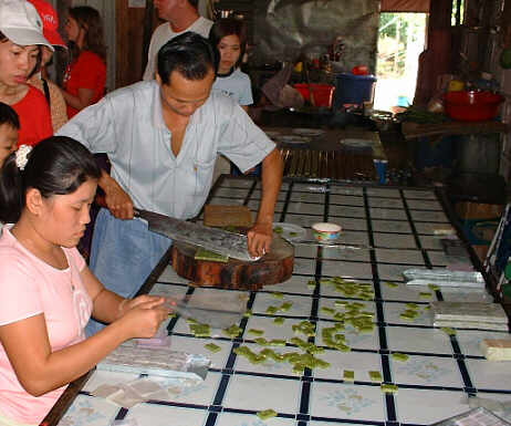 約20分で 小さな船着場へ お菓子の手作り工場と 春巻きの皮作りの見学でした。 |