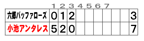 - 4回雨が強くなり制球を乱したピッチャーが3点を取られたが、更に雨が強くなり、3回終了時点で降雨コールドとなり2勝目を上げた。