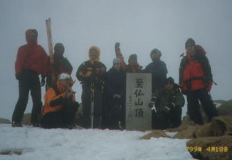 至仏山山頂で登頂記念撮影。 私1人板を担いでいますが、 登りが遅いから…。f(^_^);;; |