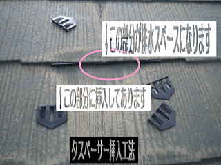 コロニアルの屋根 ←今の家屋ではポピュラーな屋根材だと思います、平葺きの洋瓦というべきでしょうか、材質は建材系で現在のものは悪名高きアスベストは含有してないはずです。 材質上、腐敗ようするに腐ったり溶けたりするわけではございませんが、製品的に最初から表面に塗装が施してありその部分が風化いたします、塗り替え・メインテナンスは必要なのですが.......... タスペーサー挿入工法 平葺きの工法故、瓦と瓦の重なり部分が当然ございます、塗り替えを施した場合、その重なり部分にどうしても塗料が入り込んでしまいます、この入り込んだ塗料がこの洋瓦平葺きの構造の横のつなぎ目から排水することをできなくしてしまいつなぎ目から入り込んだ雨水が溜まってしまい特に勾配の緩やかな屋根の場合雨漏りの原因のひとつになる可能性がありました。 重なり部分を縁切りすればそのようなことにはならないのですが、仕上がりも汚くなりますし、なにより一度縁切りしても塗装直後の塗膜どうしなので再び同化密着す場合もございます。 その同化密着を防ぐためにこの“タスペーサー”を挿入し、排水の逃げ道を確保し雨漏りを防ぐ工法です。 当方では特に勾配の緩やかなコロニアルのお客さまには特にお薦めいたしております。 ![]() |