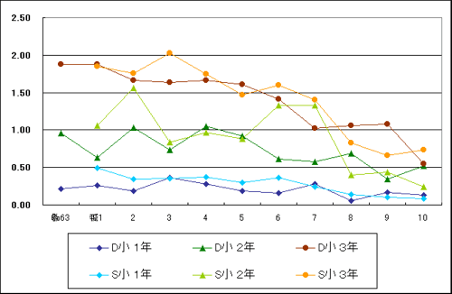 63 ~1 2 3 4 5 6 7 8 9 10 D小 1年 0.21 0.26 0.19 0.36 0.28 0.19 0.16 0.28 0.06 0.17 0.13 2年 0.96 0.63 1.03 0.73 1.05 0.92 0.61 0.58 0.69 0.34 0.52 3年 1.88 1.88 1.66 1.64 1.66 1.61 1.41 1.02 1.06 1.08 0.55 S小 1年 0.49 0.34 0.36 0.37 0.30 0.36 0.24 0.13 0.10 0.08 2年 1.06 1.56 0.84 0.97 0.89 1.33 1.33 0.40 0.44 0.24 3年 1.85 1.76 2.02 1.75 1.47 1.60 1.41 0.83 0.66 0.73