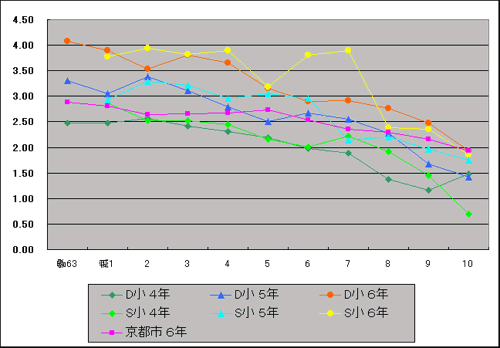 | 京都市 | 6年 | 2.88 | 2.81 | 2.64 | 2.66 | 2.68 | 2.74 | 2.53 | 2.35 | 2.30 | 2.16 | 1.94 |