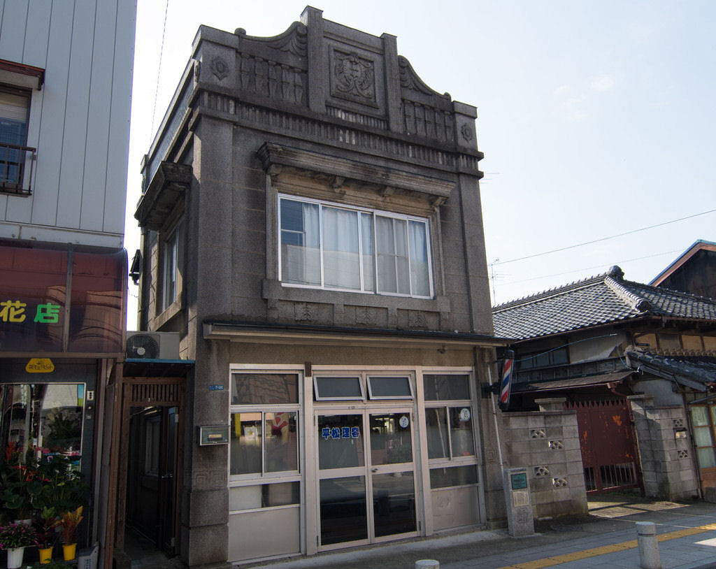 平松理容店。昭和3年建築で翌4年の大火を免れた。新しい三色ねじり棒が斜めに取り付けられているのがおもしろい。この前の通りを300メートルほど行くと、石岡小学校があり校庭で国府跡の柱穴が発掘された。 |
