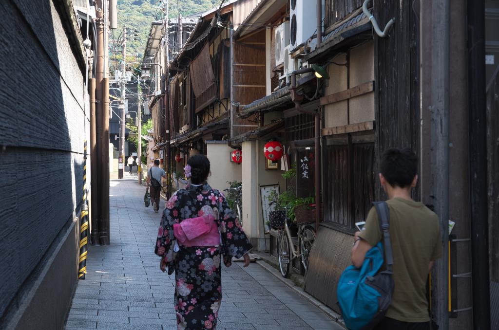 | 街には茶を振舞うお茶屋が立ち並び、客をもてなす茶立女が置かれた。まもなく、客に出す茶や団子が酒に変化したが、これがお茶屋の発祥と言われている。この水茶屋で働く茶立女が歌舞伎芝居を真似て、三味線や踊りを披露するようになったものを、京都では「芸妓(げいこ)」、その見習を「舞妓(まいこ)」と呼ぶらしい。 |