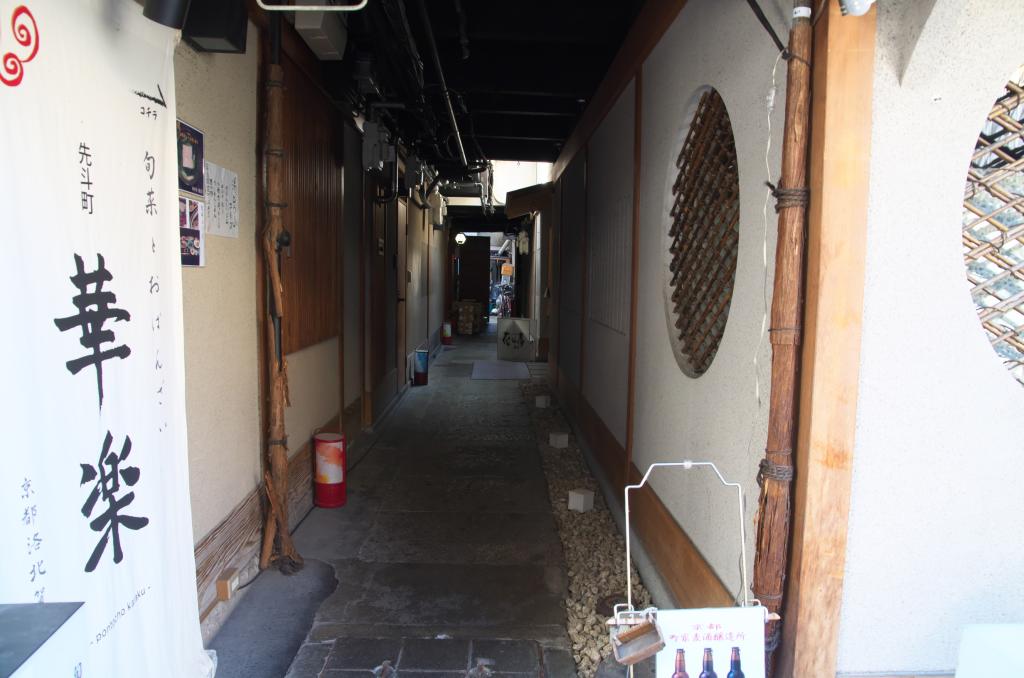 | 四条大通に出たところでまた汗が噴き出たので、甘味処「月ヶ瀬」に飛び込み\850の宇治金時で涼をとった。 すこしだけ元気が出てきたので、重い足を引きずりながら鴨川を渡り、先斗町の入口までたどり着いた。ポルトガル語由来の町名を持つこの地区は、1813年には遊廓として公認されて以来、茶店やバーが建ち並ぶ延長500メートルほどの繁華街で、通りの東側の店は鴨川に面し、納涼床を設ける飲食店が多い。「先斗町歌舞練場」まで来たら、陽も傾きかけたので高瀬川を眺めながら地下鉄京都市役所前駅へ急いだ。 |