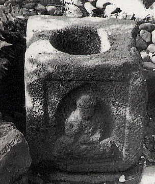 尾山神社四方仏形(金沢市) 四方物手水鉢の中でも名品で、かつて千利休が京都不審庵の手水鉢として愛好していたもので、当社の中庭にある。この手水鉢の特色は、その四隅に彫られている鳥形で、これは梟であると考えられている。鎌倉時代の一時期だけに作られた、梟の塔身を持つ宝篋印塔の塔身を用いた四方仏で、「梟の手水鉢」の別名がある。 |