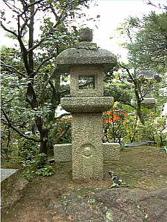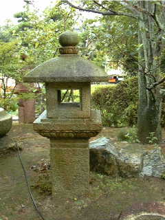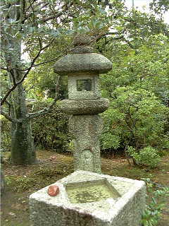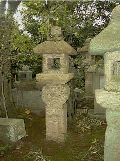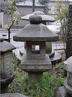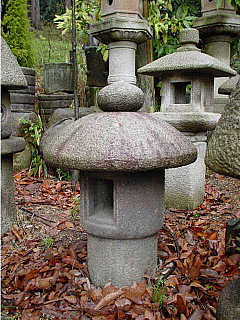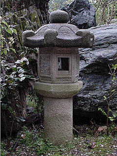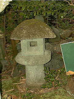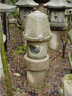 桃山時代、茶の湯の興隆により、新しく露地が生まれ、夜の茶会の為に露地の明かりとして、古社寺の石燈籠が利用されるようになり、さらには、茶人の好みのものが新しく創作された。その代表的なものが織部形石燈籠であり、竿の円部に、アルファベットを組み合わせた記号を陰刻し、その下部に立像を浮彫にしている。これを地蔵信仰に似せた隠切支丹の尊像と見て、マリア燈籠とか切支丹燈籠と言われた。実際に、十字架的な要素を強調し、竿に十文字に閂を入れたものもある。一般的には、桃山時代の茶人、古田織部が創案したものとして、織部燈籠と呼ばれている。 |