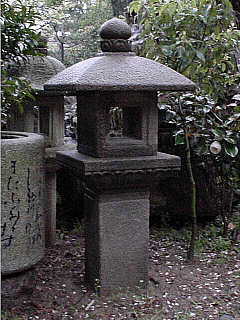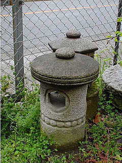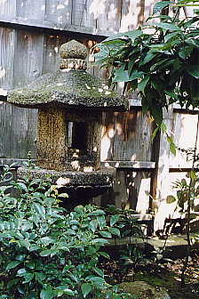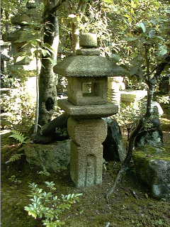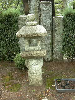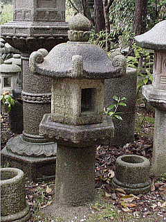 | 基礎がなく竿を地中に埋め込んで据えるもので円形・四角形が多いのですが、基本型六角型・八角型を小型にしその基礎がないような形のものもかなりあります。 活込式の燈籠は、露地の燈籠として創案され露地での明かりは、照明の範囲が限定される。腰掛待合の足元・中門の役石辺り、蹲踞の鉢明かりなどである。露地の燈籠は手元、足元に対する明かりで極めて現実的な明かりであり、その丁度よい位置と高さを調整するのに便利な活込式の方法が用いられたと思われる。基礎部をはずした活込式の風情は、侘びの世界に一致するものが好まれた。従って、この種の燈籠は、造形的に優れたものは少なく、むしろ洒落味のある風情の面白さに、その趣旨がある。 |