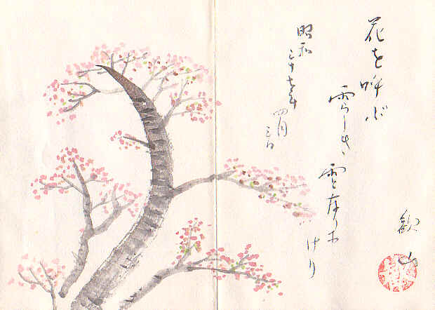 橋渡る、傘鉾さして、花の雨