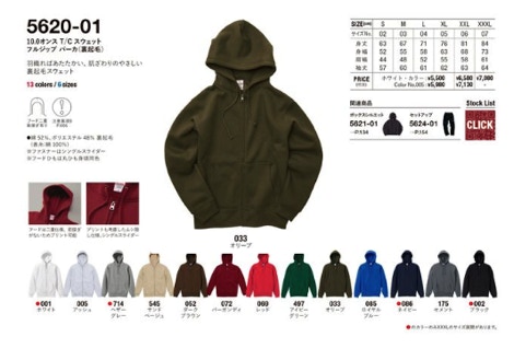 スエットジップパーカー裏起毛(5620-01)¥5,500の場合