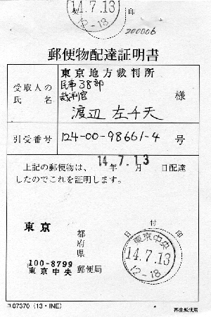 | 上記同本文と添付全書類は、同日に、東京地方裁判所、渡辺左千夫宛、東京高等裁判所、 |