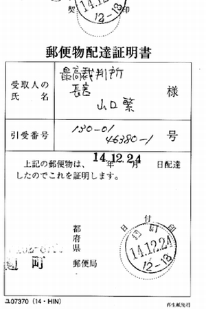 | 子・鈴木敏之・小池一利宛、最高裁判所山口繁長官宛に配達証明付郵便にて送付し |
