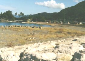 この海岸の砂浜とふもとの集落帯とを分断していた川を無理やり埋め立て、川はこれ また無理やりまっすぐに海に繋げられてしまった。埋め立てたところは人工の堤と道路と人工的 に整備され芝生まで付けられ駐車場もあるというおかしな「公園」にされ、海浜には階段状のコ ンクリートの競技場のスタンドの幅広いもののような醜い傾斜場が造成された。
