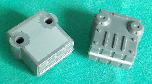ロケットランチャーポッド。 ゲート跡を処理して、側面に走っているパーティングラインを消して、パーティングラインで発生している段差を無くします。場所によっては、プラ板を細い棒状にして何本も貼って、隙間を埋めてから削り出す事で整えています。肉抜き穴も適当な大きさのプラ板を埋め込んで隙間を埋めてから平らに整えています。 正面のハッチの部分は、左右で形状が異なっているように見えましたので、ハッチのヒンジの支えと思える柱を細く切ったプラ板で表現して、左右の形状の異なりを補正しました。 |