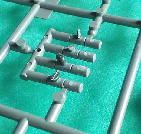 ランナーから切り離す前に、明らかに埋める必要の有るピン跡や肉抜き穴に、あらかじめ、のばしランナーの切れ端と瞬間接着剤で穴を埋めておきます。個々の部品単位の作業なので、部品を切り離してからの方が作業しやすいのは目に見えていますが、部品を一つずつランナーから切り離して整形している時間を利用して、接着剤の乾燥時間を確保するために、うめる事がわかっているピン跡と肉抜き穴はあらかじめ処置しておきます。切り離す前にできる事はしておいた方が、後の作業が楽です。 |