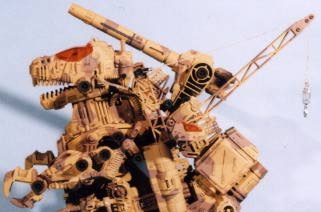 出せると言うことがわかってくると、そこは、動くことがゾイドの最大の特徴であると思っている人間が考えることは、やっぱりクレーンも連動させよう、という事でした。本当の所は、キャノン砲の上下ギミックが出来る自信がなかったので、キャノン砲の上下で苦労するだろうから、クレーンを更に上下させる苦労はしたくない、と思っていたため、当初のクレーンの上下は避けていたという面もあります。