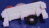 ミニ4駆用のギアセットの黒いギアの小さいギアの部分を削り、1枚の単純なギアにします。2枚作ります。そのうち一つは、軸の連結部分の長さが2mm程度になるまで短くします。(画像の左が原型、右は小さいギアの部分を切り取り軸を長さ2mmにまで短くしたモノです。)