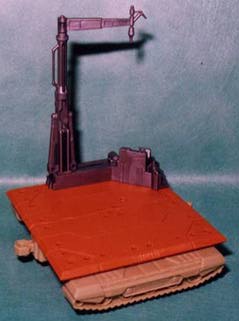 載せるのは、残りのランナーパーツの給油塔です。 位置関係は、給油塔のレール部分がキャタピラと平行となる位置。走行方向に対して右側面となり、コントロールパネルが後ろ方向になるように据え付ける事にしました。よって、画像は、左側が前方となるように想定しています。 塔本体の加工から始めます。 |