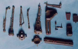 フレーム部品。 上半分のジャンクパーツを貼った部分は内部構造的にするため、メタルブラックに適当にシルバーを加えた色にしました。 下半分は外部露出する部分でもあるとして、メカ生体のグスタフに準じて濃い緑にしました。何となくの塗り分けで、厳密な境目は設定していません。 |