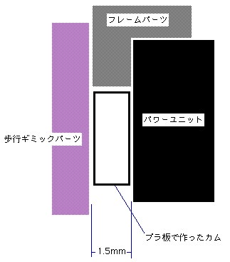 もう一つのゾイドの特徴として、一般的なプラモデルよりも各パーツの肉厚が厚いことが言えます。特にギミックにかかわるパーツは、それぞれおよそ1.5mm程の厚さがあります。これは、おそらく安全性を考慮して、必要な強度を確保するための結果であると思います。でも、この特徴がギミックの追加改造を容易にしてくれています。右の図のように、パワーユニット(ゼンマイ)と歩行ギミックパーツの間に出来るこの1.5mmの厚さの中に、ギミック部品を仕込むことが出来れば、ゾイド本体に大きな改造を加えずとも、つまるところ既存のギミックに影響させることなく新たな動きを追加することが可能となります。