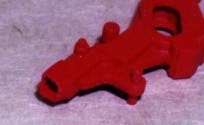 尻尾の最先端部分は、蛇腹状になっています。これの一番最初の溝の部分で切り取ります。画像は、片側しかやっていませんが、もちろん両方ともやります。 蛇腹部分の一番最初の溝で切り取りますと、結果的に尻尾のジョイントを受ける穴が大きくなります。これにより尻尾が上下に動く際のスペースを確保することになります。 |