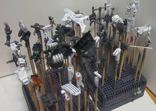 その後、エアブラシで塗装するので、一つ一つ持ち手をつけます。ギミック部分には、マスキングテープで塗料が回らないようにします。