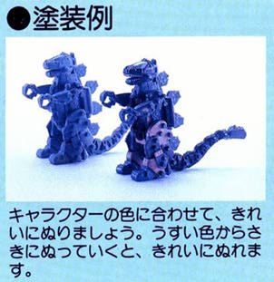 材質はどのようなモノであるかはわからないが、パッケージ裏面には、塗装例が紹介されており、プラカラーが使用可能なのは明らかである。ミニチュアモデルと言えどもゾイド。当初のゾイドは、改造して遊ぶことが目指されていたおもちゃであった。既にバトルストーリーも登場していた時代の商品ではあるが、まだこの時代には、ゾイド当初の「ゾイド改造計画」はしっかりと受け継がれていたのかも知れない。