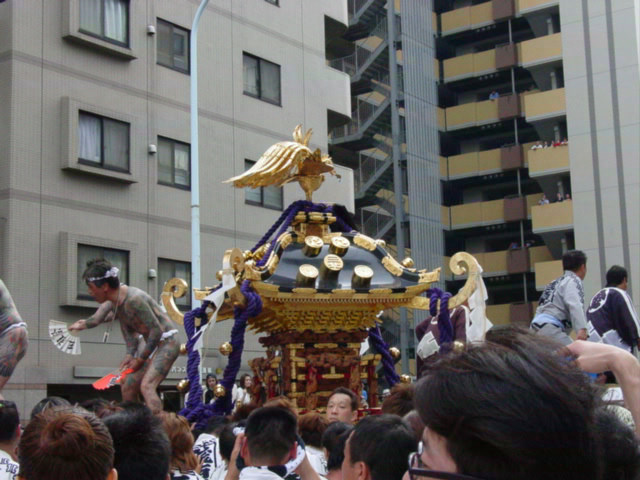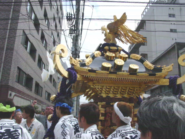 宮神輿渡御の興奮もしばしの談笑で少しずつ治まってきて、次は三北神輿の渡御開始を待つばかり・・・倉に入ってた三北神輿が運び出されて来たら、さっきの喧噪はなくなって、みんな和やかな雰囲気になっていました。三北神輿の町内渡御の始まりぃ〜ってなわけで、さっきの敵をとったかのように?すぐに入らせてもらっちゃいました。知り合いも私の前に入れてもらって。これがね〜すごくいいリズムでさ〜すっごい担ぎやすかったのよね〜。高さもちょうど良かったしぃ〜。リズミカルに担げてしまって楽しかったです。 |