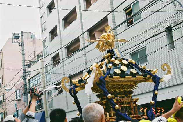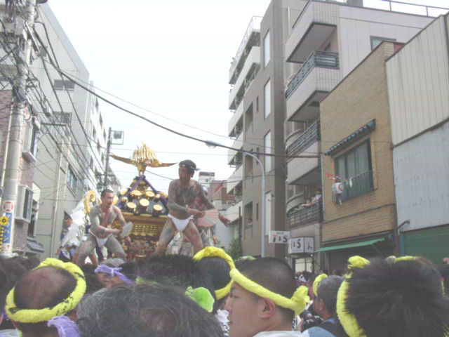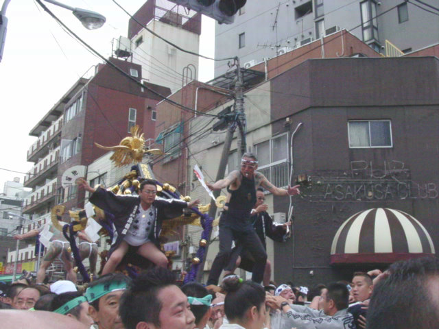 国際通りの手前で交代。再出発して国際通りに出てみれば、周りは見物人ですごいことになってました。もちろん国際通りの交通もストップ。今回は反対車線にまで流れてしまって・・・宮渡御のうっぷんを晴らすかのような感じでした。今年は国際通りと言問通りが三北神輿の「お祭り広場です」なんて私も出してしまいましたが、まさに「三北神輿のお祭り広場」と化してしまいました。私的には思いっきり楽しめる、こっち(今年の)の方が絶対いいと思います。昨日の仲見世行脚(笑)でどうやらまた三北神輿のファンが増えたみたいですし、ワンマンショーには今年のバージョンが一番ですよ。国際通り→言問通りと三北神輿が進んでいきます。何回か私も担ぎに入っては、写真を撮り〜の繰り返しをしていました。 |