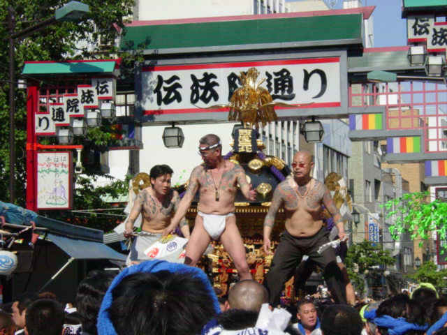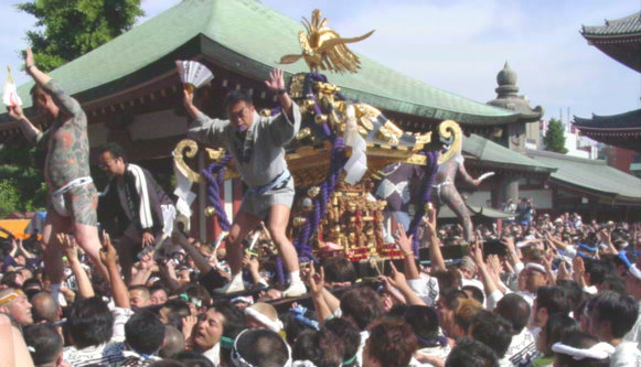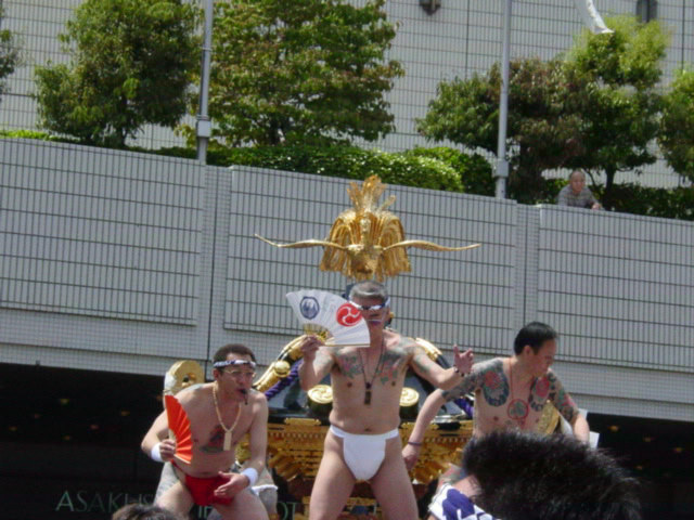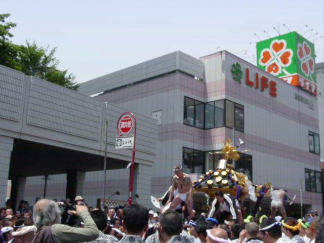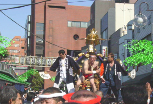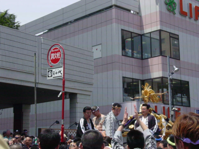 いいねいいね〜三北神輿、やっぱり他とは違うよね〜! 歩道橋の上も下もギャラリーでいっぱい!勇壮に国際通りを横断するのでしたっ。 一部?改装された「花やしき」横を通って神輿は浅草寺裏を目指すのです。 といっても数回途中で神輿を降ろすんですがね。<他のとこはどうなんでしょ? |