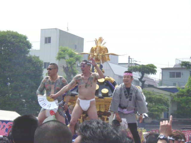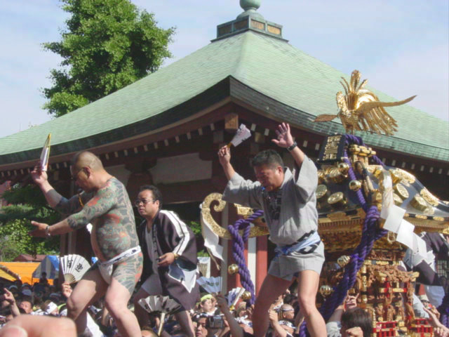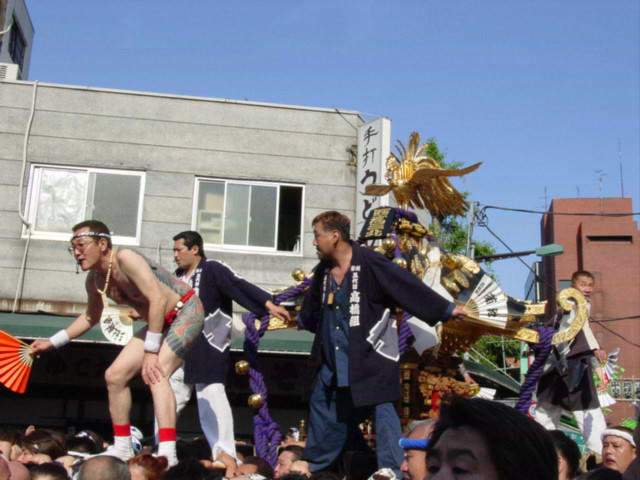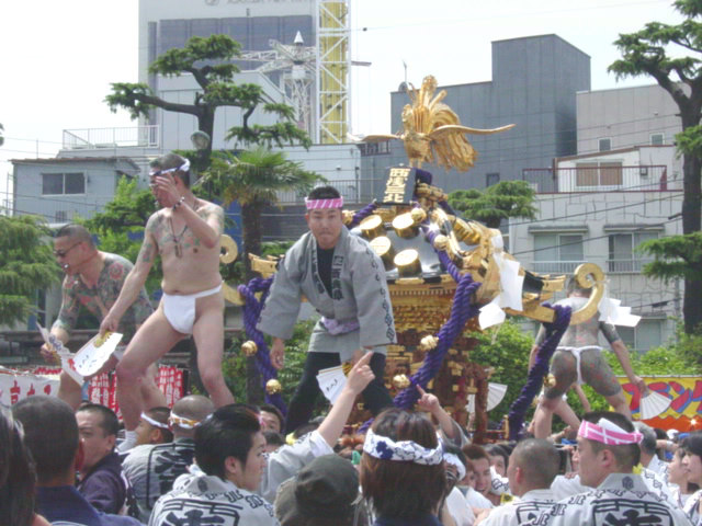 さ〜て!待ちに待った三社祭の朝がやってきましたっ。天気も良すぎるくらいいいみたい。1年ぶりの祭り支度に『こんなんで良いかな?』と時間がかかる。身支度が出来てくるとだんだんテンションも上がってくるんですね〜これが!いざっ出陣〜!浅草に着けばもう祭りの雰囲気いっぱいでいい感じなんですよね。駅近くの写真屋さんには三社祭の写真が飾ってあって(いつもですが)、そこに去年の連合の三北神輿周辺の写真がありました。 仲見世をいそいそと突き抜けてビューホテル付近まで近づくと白半纏と黒半纏があちこちに見えてきます。 毎年ですが町会に到着すると1年ぶりにいろんな人と再会して話をしますが、昨日も会ってたみたいな、みんなそんな感じで私はこういうの好きですね〜。 |