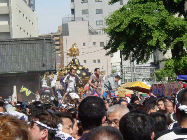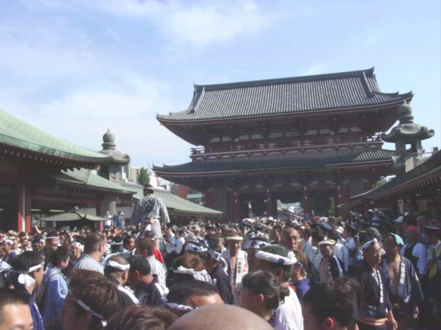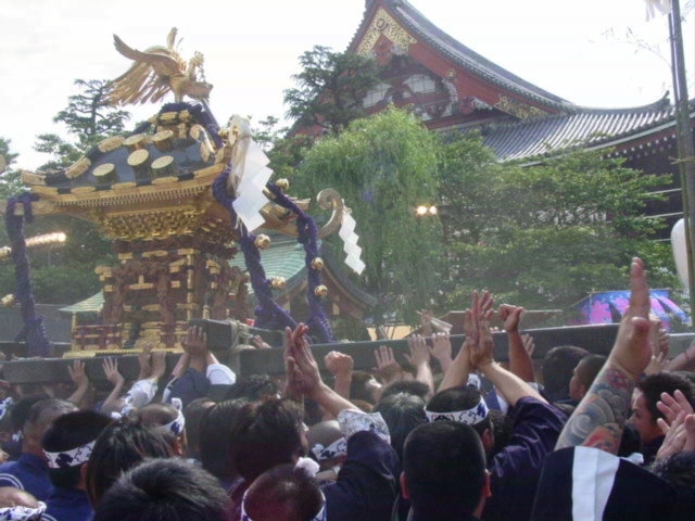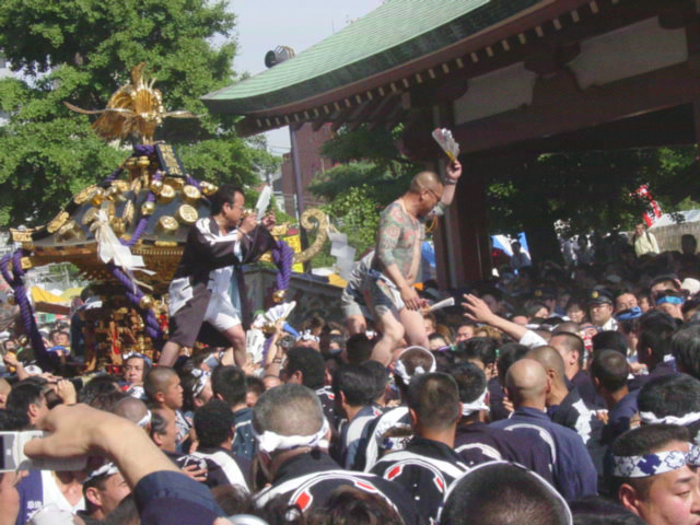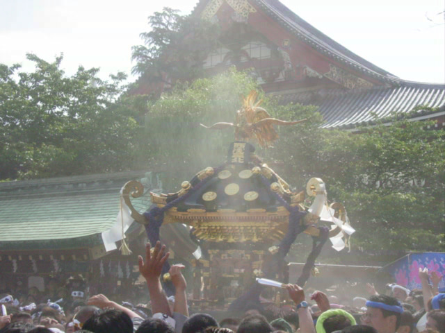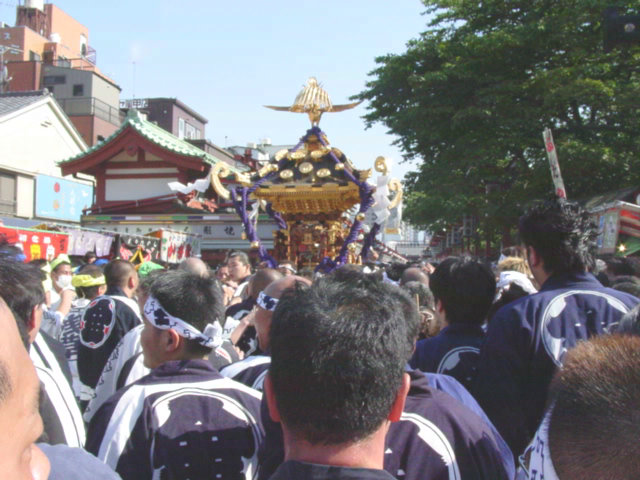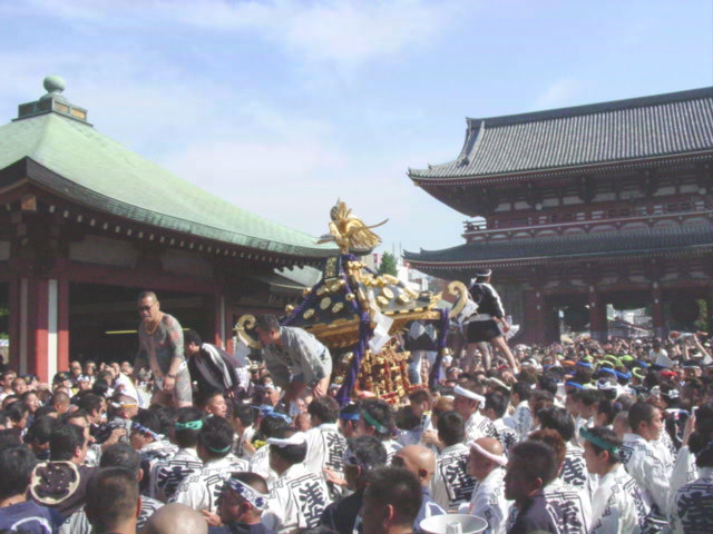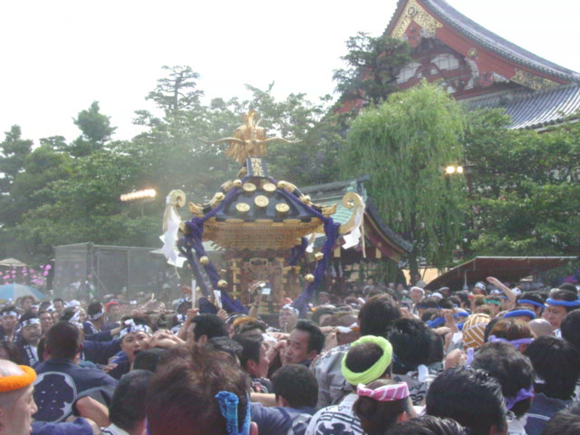 いつものように本堂前で前に行ったり後ろに行ったり、後続もいないから余裕でやってるんだな〜と見ていたら、神輿は後ろを向いたまま前方に進み始めてしまったのです!!えっ?!『どこ行くの〜?!』と近くにいた人と『あれっ?』と状況がつかめずに、その間も神輿は宝蔵門へ向かう様子。『え〜まじぃ〜?!』叫びながらあわてて神輿に着いていきましたよ!予定のコースではないらしいんだけど、ある意味予定のコースらしく(わけわかんない?・爆)、三北神輿は宝蔵門にかかる提灯をギリギリくぐり、仲見世に入っていったのでした。びっくり〜!だけど思いも寄らない光景に興奮してしまいましたっ。 | ||