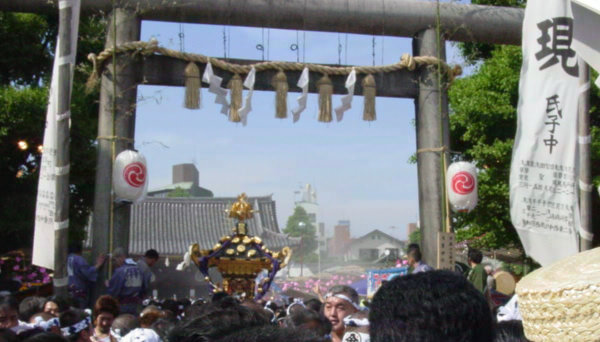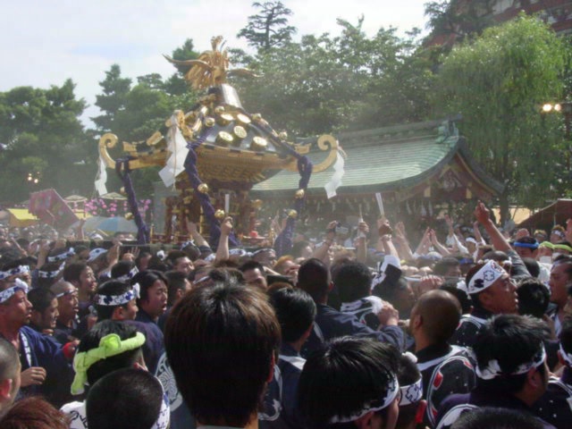 神輿が旋回を始めたら、速攻移動です!!あたりをチラッと見たらロープの外を回って前へ行く人たちが!!すかさずその後をくっついて行く私。にゃはは〜。難なく?神輿の前に出ることに成功!一人でVサイン状態でした(笑)そして鳥居の前から激写!(ではないけどっ)基本的に前じゃないと危ないからね〜。 | ||